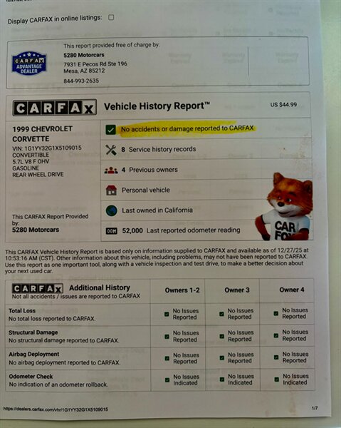 1999 Chevrolet Corvette Convertible w/52k miles. Very clean. No accidents.